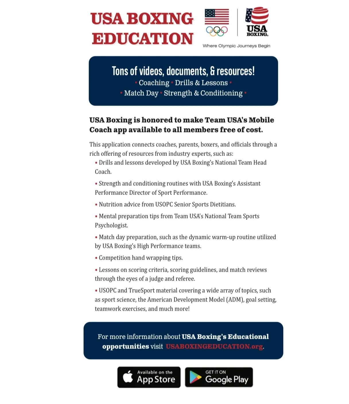 USABoxingeducation.org is an educational platform that serves as a one stop shop for all coaching education needs. If you are looking to learn more about proper techniques, diet & nutrition, strength and conditioning, or simply being a better coach overall, there are a variety of videos and resources made available to members free of charge on the platform. USA Boxing’s education platform can be accessed online at usaboxingeducation.org or by downloading the USA Boxing Education app on your smartphone. Members login to the platform using the same username and password that is used to login to their membership account in WebPoint.
